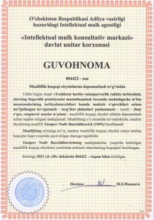 | 5673 | №004422 | Ilmiy o‘quv, rangtasvir asarlar to‘plami-"Yoshlarni harbiy-vatanparvarlik ruhida tarbiyalash, ularning fuqarolik pozitsiyasini mustahkamlash borasida maktabgacha ta’lim muassasalarining tarbiyalanuvchilari hamda maktab o‘quvchilari uchun mo‘ljallangan ko‘rgazmali - targ‘ibot plakatlari jamlanmasi" | Yusupov Nodir Baxriddinovich (100%) | Yusupov Nodir Baxriddinovich | 12/30/2021 | ![]() |