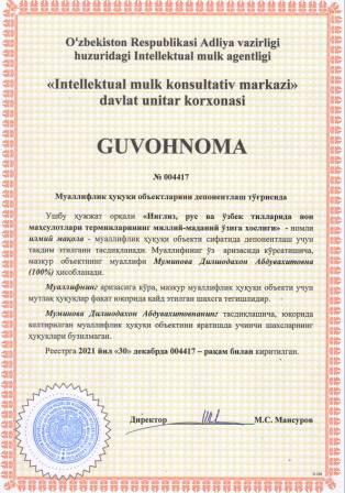 | 5678 | №004417 | Илмий мақола - "Инглиз, рус ва ўзбек тилларида нон маҳсулотлари терминларининг миллий-маданий ўзига хослиги" | Муминова Дилшодахон Абдувахитовна (100%) | Муминова Дилшодахон Абдувахитовна | 12/30/2021 | ![]() |
