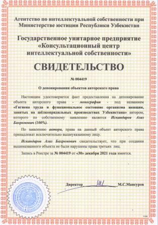 | 5676 | №004419 | Монография - "Гигиена труда и функциональное состояние организма женщин, занятых на шёлкопрядильных производствах Узбекистана" | Искандаров Азиз Бахромович (100%) | Искандаров Азиз Бахромович | 12/30/2021 | ![]() |
