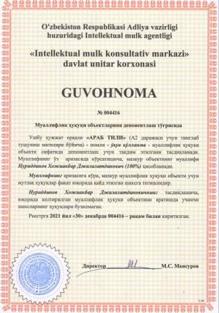 | 5679 | №004416 | Ўқув қўлланма - "АРАБ ТИЛИ" (А2 даражаси учун тинглаб тушуниш матнлари бўйича) | Нуриддинов Хожиакбар Джалалитдинович (100%) | Нуриддинов Хожиакбар Джалалитдинович | 12/30/2021 | ![]() |