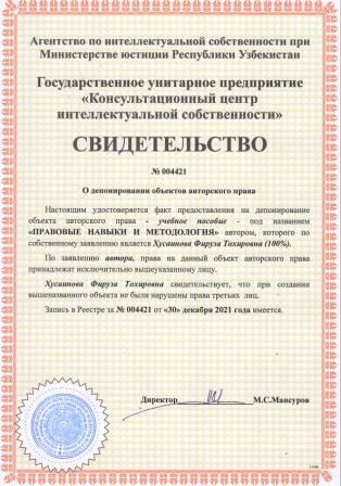 | 5674 | №004421 | Учебное пособие - "ПРАВОВЫЕ НАВЫКИ И МЕТОДОЛОГИЯ" | Хусаинова Фируза Тохировна (100%) | Хусаинова Фируза Тохировна | 12/30/2021 | ![]() |