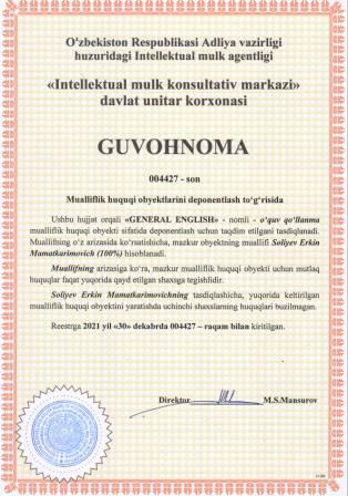 | 5668 | №004427 | O‘quv qo‘llanma -"GENERAL ENGLISH" | Soliyev Erkin Mamatkarimovich (100%) | Soliyev Erkin Mamatkarimovich | 12/30/2021 | ![]() |
