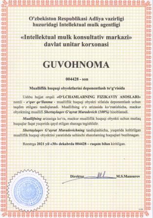 | 5667 | №004428 | O‘quv qo‘llanma -"O‘LCHAMLARNING FIZIKAVIY ASOSLARI" | Shertaylaqov G‘ayrat Muradovich (100%) | Shertaylaqov G‘ayrat Muradovich | 12/30/2021 | ![]() |