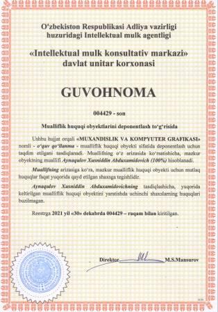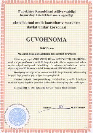 | 5663 | №004432 | O‘quv qo‘llanma -"MUXANDISLIK VA KOMPYUTER GRAFIKASI" | Xatamov Azizbek Yaxraqulovich (100%) | Xatamov Azizbek Yaxraqulovich | 12/30/2021 | ![]() |
