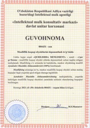 | 5664 | №004431 | O‘quv qo‘llanma -"QURILISHDA MENEJMENT" | Aynakulov Muxitdin Abduxamidovich (100%) | Aynakulov Muxitdin Abduxamidovich | 12/30/2021 | ![]() |