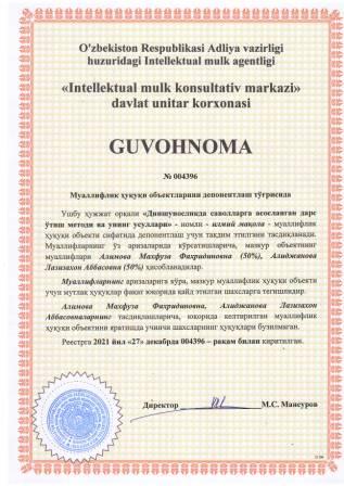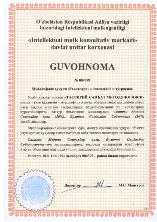 | 5695 | №004400 | Илмий ишланма - "Кадрлар захирасини шакллантириш институтини амалиётда фаол қўллашда аёлларни инновацион бошқарув фаолиятига тайёрлаш» ТРЕНИНГ ДАСТУРИ " | Мухамедова Дилбар Гафурджановна (50%), Абдуллажанова Дилнозахон Султанбековна (50%) | Мухамедова Дилбар Гафурджановна, Абдуллажанова Дилнозахон Султанбековна | 12/30/2021 | ![]() |