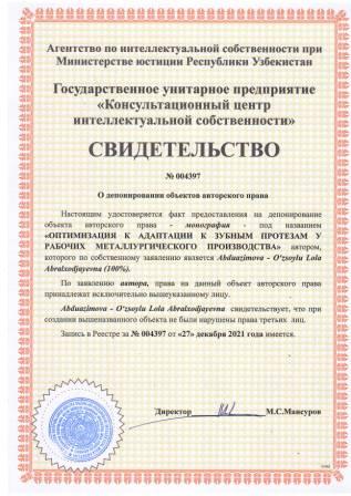 | 5698 | №004397 | Монография - "ОПТИМИЗАЦИЯ К АДАПТАЦИИ К ЗУБНЫМ ПРОТЕЗАМ У РАБОЧИХ МЕТАЛЛУРГИЧЕСКОГО ПРОИЗВОДСТВА" | Abduazimova - O‘zsoylu Lola Abralxodjayevna (100%) | Abduazimova - O‘zsoylu Lola Abralxodjayevna | 12/27/2021 | ![]() |