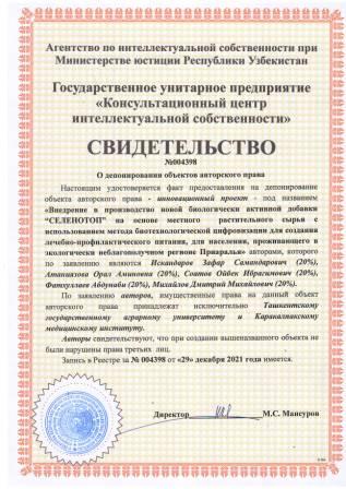 | 5697 | №004398 | Инновационный проект - "Внедрение в производство новой биологически активной добавки “СЕЛЕНОТОП” на основе местного растительного сырья с использованием метода биотехнологической цифровизации для создания лечебно-профилактического питания, для населения, проживающего в экологически неблагополучном регионе Приаралья" | Искандаров Зафар Самандарович (20%), Атаниязова Орал Аминовна (20%), Соатов Ойбек Ибрагимович (20%), Фатхуллаев Абдунаби (20%), Михайлов Дмитрий Михайлович (20%) | Ташкентский государственный аграрный университет и Каракалпакский медицинский институт. | 12/29/2021 | ![]() |