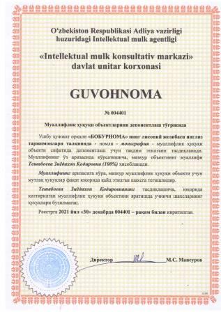 | 5694 | №004401 | Монография - "БОБУРНОМА" нинг лисоний жозибаси инглиз таржимонлари талқинида | Тешабоева Зиёдахон Қодировна (100%) | Тешабоева Зиёдахон Қодировна | 12/30/2021 | ![]() |