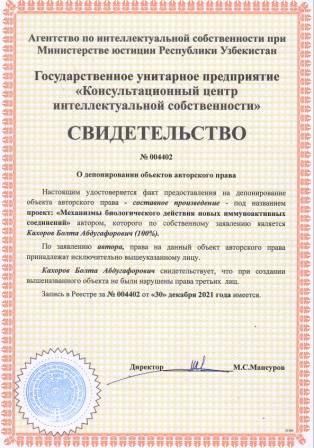 | 5693 | №004402 | Составное произведение - проект: "Механизмы биологического действия новых иммуноактивных соединений" | Кахоров Болта Абдугафорович (100%) | Кахоров Болта Абдугафорович | 12/30/2021 | ![]() |