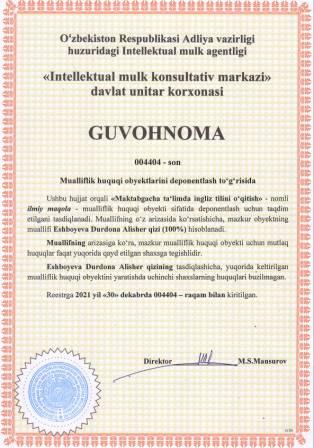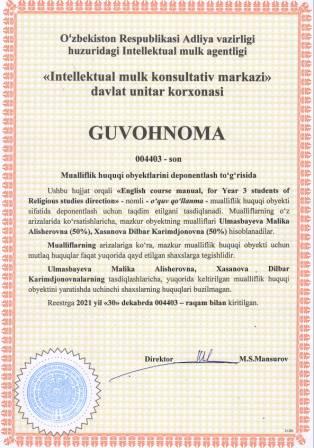 | 5692 | №004403 | O‘quv qo‘llanma -"English course manual, for Year 3 students of Religious studies direction" | Ulmasbayeva Malika Alisherovna (50%), Xasanova Dilbar Karimdjonovna (50%) | Ulmasbayeva Malika Alisherovna, Xasanova Dilbar Karimdjonovna | 12/30/2021 | ![]() |