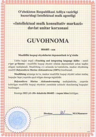 | 5690 | №004405 | O‘quv qo‘llanma -"Teaching and integrating language skills" | Balyasnikova Marina Aleksandrovna (100%) | Balyasnikova Marina Aleksandrovna | 12/30/2021 | ![]() |