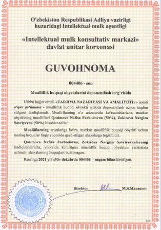 | 5689 | №004406 | O‘quv qo‘llanma -"TARJIMA NAZARIYASI VA AMALIYOTI" | Qosimova Nafisa Farhodovna (50%), Zokirova Nargiza Savriyevna (50%) | Qosimova Nafisa Farhodovna, Zokirova Nargiza Savriyevna | 12/30/2021 | ![]() |