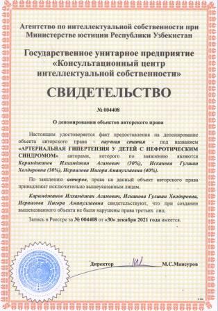 | 5687 | №004408 | Научная статья – "АРТЕРИАЛЬНАЯ ГИПЕРТЕНЗИЯ У ДЕТЕЙ С НЕФРОТИЧЕСКИМ СИНДРОМОМ" | Каримджанов Илхамджан Асамович (30%), Исканова Гулшан Холдоровна (30%), Исраилова Нигора Амануллаевна (40%) | Каримджанов Илхамджан Асамович, Исканова Гулшан Холдоровна, Исраилова Нигора Амануллаевна | 12/30/2021 | ![]() |