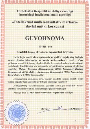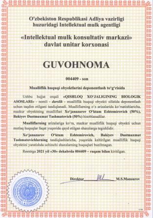 | 5686 | №004409 | Darslik - "QISHLOQ XO‘JALIGINING BIOLOGIK ASOSLARI" | Xo‘janazarov O‘ktam Eshtemirovich (50%), Bakiyev Dustmaxmat Tashmatovich (50%) | Xo‘janazarov O‘ktam Eshtemirovich, Bakiyev Dustmaxmat Tashmatovich | 12/30/2021 | ![]() |