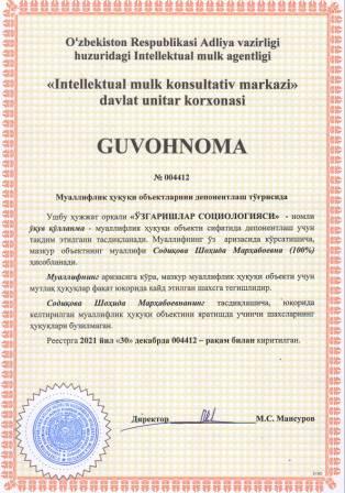 | 5683 | №004412 | Ўқув қўлланма - "ЎЗГАРИШЛАР СОЦИОЛОГИЯСИ" | Содиқова Шоҳида Марҳабоевна (100%) | Содиқова Шоҳида Марҳабоевна | 12/30/2021 | ![]() |
