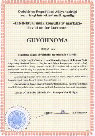 | 5682 | №004413 | Ilmiy maqola -"Structural And Semantic Aspects of Lexemic Units Expressing National Value in English and Uzbek Languages" | Shamsematova Barno Rixsivayevna (100%) | Shamsematova Barno Rixsivayevna | 12/30/2021 | ![]() |