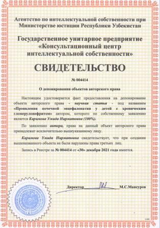 | 5681 | №004414 | Научная статья – "Проявления почечной энцефалопатии у детей с хроническим гломерулонефритом" | Каримова Умида Нирматовна (100%) | Каримова Умида Нирматовна | 12/30/2021 | ![]() |