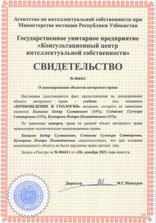| 5684 | №004411 | Учебник - "ПОЧВОВЕДЕНИЕ И ГЕОЛОГИЯ" | Камилов Бобир Султанович (34%), Содикова Гулчехра Сатторовна (33%), Кучкарова Нодира Пазитдиновна (33%) | Камилов Бобир Султанович, Содикова Гулчехра Сатторовна, Кучкарова Нодира Пазитдиновна | 12/30/2021 | ![]() |