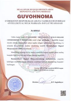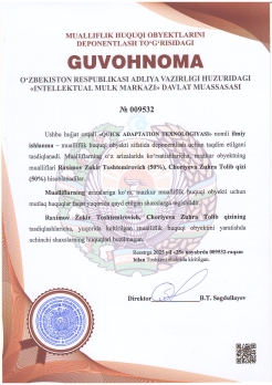 | 580 | №009532 | Ilmiy ishlanma – "QUICK ADAPTATION TEXNOLOGIYASI" | Raximov Zokir Toshtemirovich (50%), Choriyeva Zuhra Tolib qizi (50%) | Raximov Zokir Toshtemirovich, Choriyeva Zuhra Tolib qizi | 11/25/2025 | ![]() |