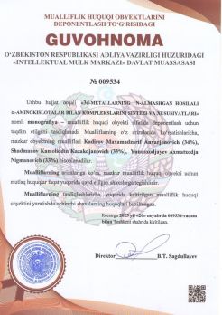 | 578 | №009534 | Monografiya – "3d-MЕTALLARNING N-ALMASHGAN HOSILALI -AMINOKISLOTALAR BILAN KOMPLЕKSLARINI SINTЕZI VA XUSUSIYATLARI" | Kadirov Maxamadzarif Anvarjonovich (34%), Shadmanov Kamoliddin Kazakdjanovich (33%), Yunusxodjayev Axmatxodja Nigmanovich (33%) | Kadirov Maxamadzarif Anvarjonovich, Shadmanov Kamoliddin Kazakdjanovich, Yunusxodjayev Axmatxodja Nigmanovich | 11/25/2025 | ![]() |
