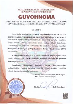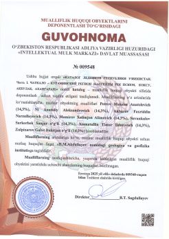| 565 | №009547 | Ilmiy maqola – "HISOR TOG‘INING JANUBI-G‘ARBIY TARMOQLARIDA RIVOJLANGAN ERTA KARBON DAVRI VUKLANOGEN HOSILALARINING AKSESSOR-MINERALOGIK IXTISOSLASHUVI" | Mamarozikov Usmonjon Dovronovich (30%), Hamrayev Ahmadali Xurrom o‘g‘li (20%), Saitov Nuriddin Erkin o‘g‘li (20%), Normatov O‘tkir Abdijamilovich (20%), Ikromov O‘tkir Olimovich (10%) | Mamarozikov Usmonjon Dovronovich, Hamrayev Ahmadali Xurrom o‘g‘li, Saitov Nuriddin Erkin o‘g‘li, Normatov O‘tkir Abdijamilovich, Ikromov O‘tkir Olimovich | 12/02/2025 | ![]() |