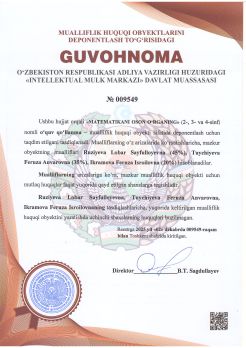 | 563 | №009549 | O‘quv qo‘llanma – "MATEMATIKANI OSON O‘RGANING" | Ruziyeva Lobar Sayfulloyevna, Tuychiyeva Feruza Anvarovna, Ikramova Feruza Isroilovna | Ruziyeva Lobar Sayfulloyevna, Tuychiyeva Feruza Anvarovna, Ikramova Feruza Isroilovna | 12/02/2025 | ![]() |