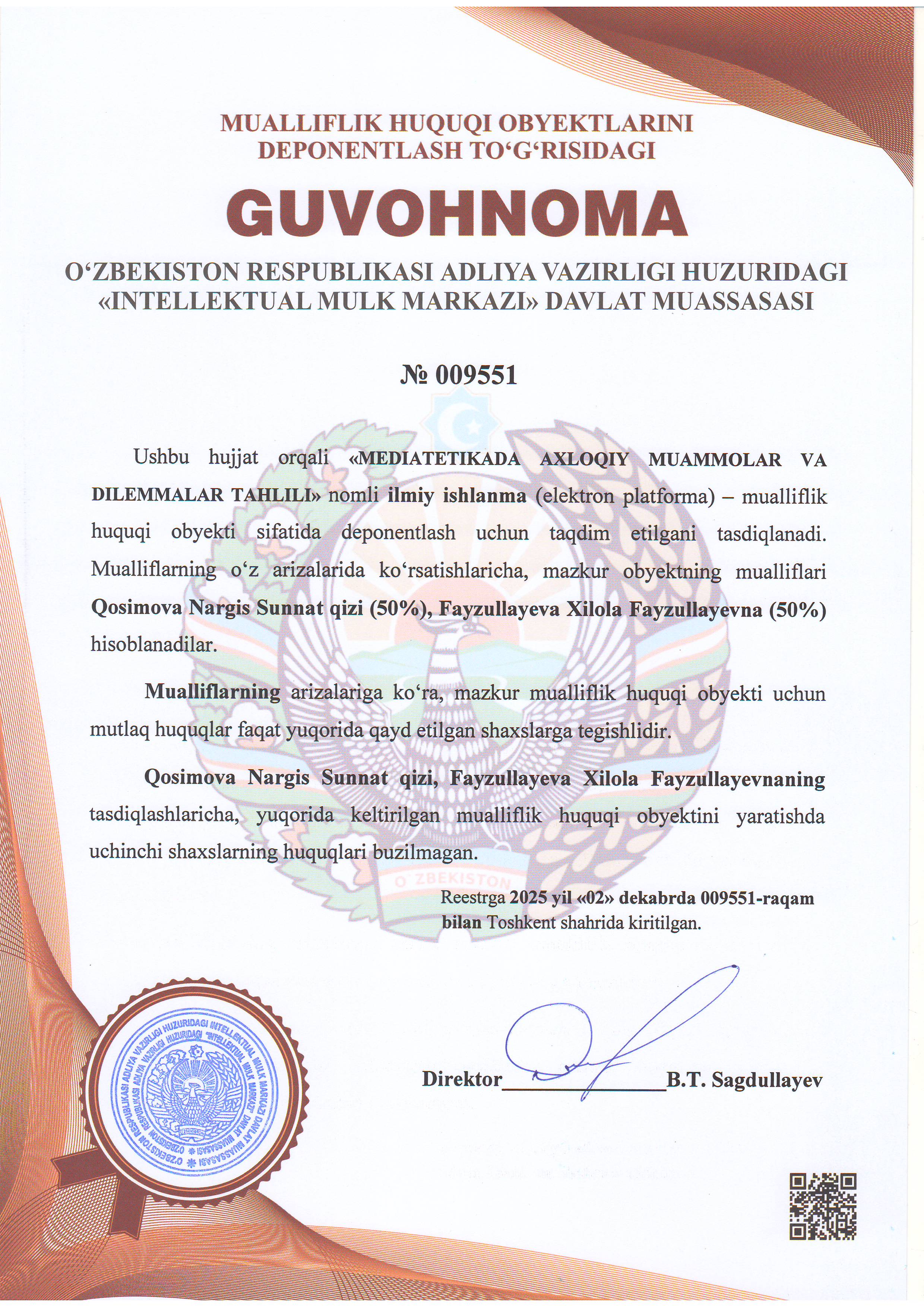 | 561 | №009551 | ilmiy ishlanma (elektron platforma) – "MEDIATETIKADA AXLOQIY MUAMMOLAR VA DILEMMАLAR TAHLILI" | Qosimova Nargis Sunnat qizi (50%), Fayzullayeva Xilola Fayzullayevna (50%) | Qosimova Nargis Sunnat qizi, Fayzullayeva Xilola Fayzullayevna | 12/02/2025 | ![]() |