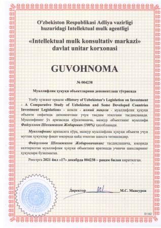 | 5857 | №004238 | Илмий мақола - "History of Uzbekistan’s Legislation on Investment - A Comparative Study of Uzbekistan and Some Developed Countries Investment Legislation" | Файзуллоев Шохижахон Жобирович (100%) | Файзуллоев Шохижахон Жобирович | 12/17/2021 | ![]() |