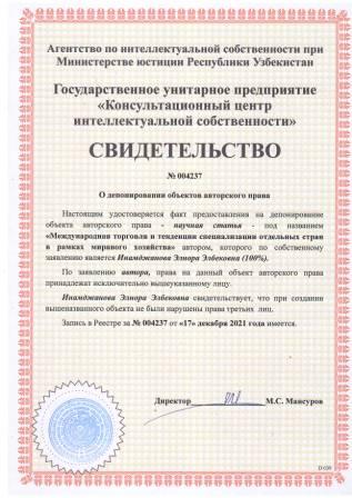 | 5858 | №004237 | Научная статья – "Международная торговля и тенденции специализации отдельных стран в рамках миравого хозяйства" | Инамджанова Элнора Элбековна (100%) | Инамджанова Элнора Элбековна | 12/17/2021 | ![]() |