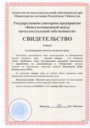 | 5856 | №004239 | Научная статья – "Опыт зарубежных стран регулирования рекламной деятельности и перспективы их имплементации в Узбекистане" | Имамалиева Диёра Имамали қизи (100%) | Имамалиева Диёра Имамали қизи | 12/17/2021 | ![]() |
