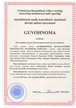 | 5853 | №004242 | Ўқув қўлланма - "O‘ZBEKISTONNI RIVOJLANTIRISH STRATEGIYASI. FUQAROLIK JAMIYATI" | Хасанов Рахмонали (60%), Утамурадов Акбар (5%), Мусаев Одил Рахматович (25%), Назаров Насриддин Атакулович (10%) | Камолиддин Беҳзод номидаги миллий рассомлик ва дизайн институти | 12/20/2021 | ![]() |