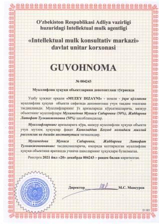| 5852 | №004243 | Ўқув қўлланма - "MUZEY DIZAYNI" | Мухамедова Муниса Сабировна (50%), Жаббарова Латофат Тулкинжоновна (50%) | Камолиддин Беҳзод номидаги миллий рассомлик ва дизайн институти | 12/20/2021 | ![]() |