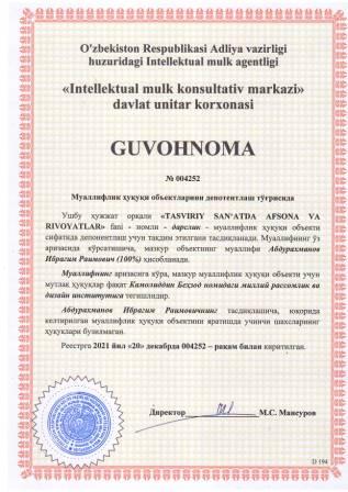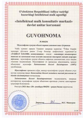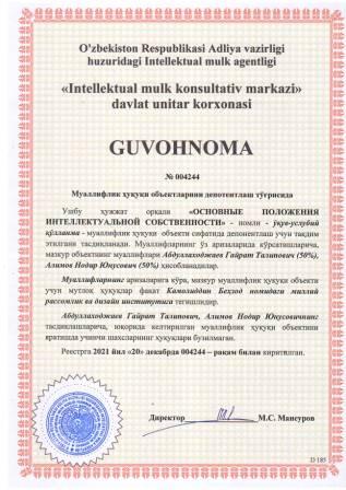 | 5851 | №004244 | Ўқув-услубий қўлланма - "ОСНОВНЫЕ ПОЛОЖЕНИЯ ИНТЕЛЛЕКТУАЛЬНОЙ СОБСТВЕННОСТИ" | Абдуллаходжаев Гайрат Талипович (50%), Алимов Нодир Юнусович (50%) | Камолиддин Беҳзод номидаги миллий рассомлик ва дизайн институти | 12/20/2021 | ![]() |