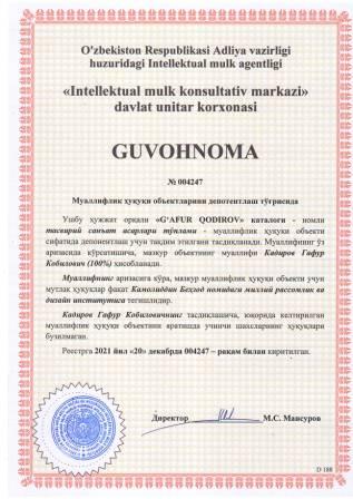 | 5848 | №004247 | Тасвирий санъат асарлари тўплами - "G‘AFUR QODIROV" каталоги | Кадиров Гафур Кобилович (100%) | Камолиддин Беҳзод номидаги миллий рассомлик ва дизайн институти | 12/20/2021 | ![]() |