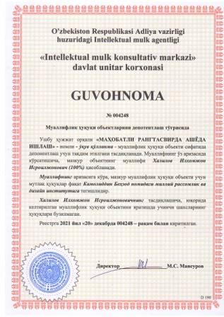 | 5850 | №004245 | Ўқув қўлланма - "FOTOGRAFIYA" | Нишанова Камола Солижон қизи (100%) | Камолиддин Беҳзод номидаги миллий рассомлик ва дизайн институти | 12/20/2020 | ![]() |