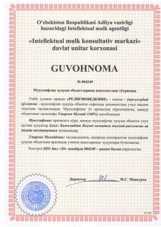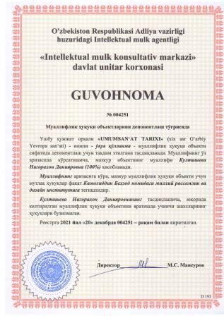 | 5846 | №004249 | Ўқув-услубий қўлланма - "РЕЛИГИОВЕДЕНИЕ" | Умарова Мухайё (100%) | Камолиддин Беҳзод номидаги миллий рассомлик ва дизайн институти | 12/20/2021 | ![]() |