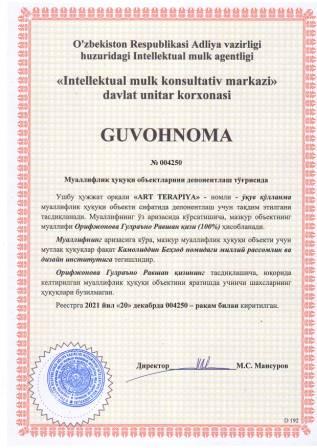 | 5845 | №004250 | Ўқув қўлланма - "ART TERAPIYA" | Орифжонова Гулраъно Равшан қизи (100%) | Камолиддин Беҳзод номидаги миллий рассомлик ва дизайн институти | 12/20/2021 | ![]() |