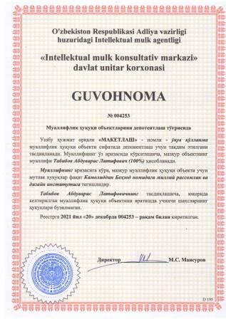 | 5842 | №004253 | Ўқув қўлланма - "МАКЕТЛАШ" | Табибов Абдуварис Латифович (100%) | Камолиддин Беҳзод номидаги миллий рассомлик ва дизайн институти | 12/20/2021 | ![]() |