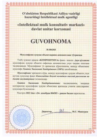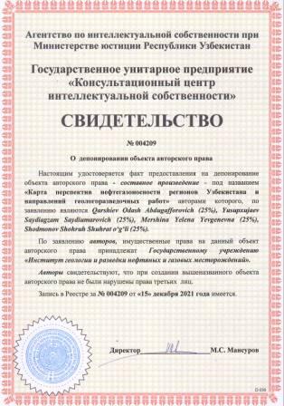 | 5886 | №004209 | Составное произведение - "Карта перспектив нефтегазоносности регионов Узбекистана и направлений геологоразведочных работ" | Qarshiev Odash Abdugafforovich (25%), Yusupxujaev Saydiagzam Saydiumarovich (25%), Mershina Yelena Yevgenevna (25%), Shodmonov Shohruh Shuhrat o‘g‘li (25%) | Государственному учреждению "Институт геологии и разведки нефтяных и газовых месторождений" | 12/15/2021 | ![]() |