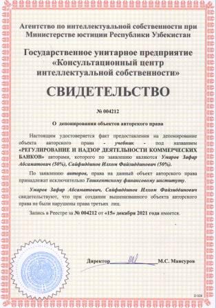 | 5883 | №004212 | Учебник - "РЕГУЛИРОВАНИЕ И НАДЗОР ДЕЯТЕЛЬНОСТИ КОММЕРЧЕСКИХ БАНКОВ" | Умаров Зафар Абсаматович (50%), Сайфиддинов Илхом Файзиддинович (50%) | Ташкентский финансовый институт | 12/15/2021 | ![]() |
