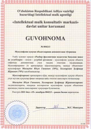 | 5882 | №004213 | Услубий қўлланма - "Раҳбар фаолиятини педагогик баҳолаш шакл ва услублари" | Махмудов Юсуп Ганиевич (30%), Холмирзаев Зулфиқор Жўраевич (70%) | Махмудов Юсуп Ганиевич, Холмирзаев Зулфиқор Жўраевич | 12/15/2021 | ![]() |