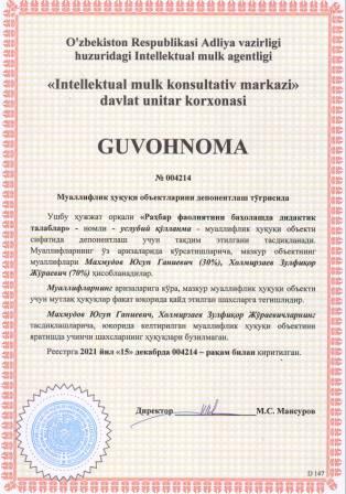 | 5881 | №004214 | Услубий қўлланма - "Раҳбар фаолиятини баҳолашда дидактик талаблар" | Махмудов Юсуп Ганиевич (30%), Холмирзаев Зулфиқор Жўраевич (70%) | Махмудов Юсуп Ганиевич, Холмирзаев Зулфиқор Жўраевич | 12/15/2021 | ![]() |