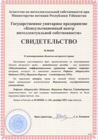 | 5889 | №004206 | Методическое пособие - "Обыкновенные дифференциальные уравнения первого порядка" | Рафиков Абдурасулбек Набиевич (50%), Икрамова Наргиса Саидакбаровна (50%) | Ферганский государственный университет | 12/10/2021 | ![]() |