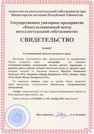 | 5888 | №004207 | Монография - "Совершенствование конструкций, методы расчета параметров и режимов работы рабочих органов очистителя хлопка от крупного сора" | Максудов Равшанжон Хасанович (25%), Шухратов Шароф Шухратович (25%), Джураев Анвар (25%), Якубов Инъам Даниярович (25%) | Ферганский государственный университет | 12/10/2021 | ![]() |