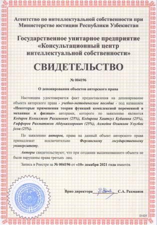 | 5899 | №004196 | Учебно-методическое пособие -"Некоторые применения теории функций комплексной переменной в механике и физике" | Кодиров Комилжон Рахимович (25%), Кодирова Хаитгул Кубаевна (25%), Ғаффоров Рахматжон Абдукаххорович (25%), Ахмедов Олимхон Улугбек ўғли (25%) | Ферганский государственный университет | 12/10/2021 | ![]() |