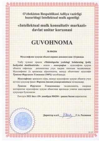 | 5891 | №004204 | Монография - "Maktabgacha yoshdagi bolalarning ijodiy faoliyatini shakllantirish" | Ўринова Ферузахон Улжаевна (100%) | Фарғона давлат университети | 12/10/2021 | ![]() |