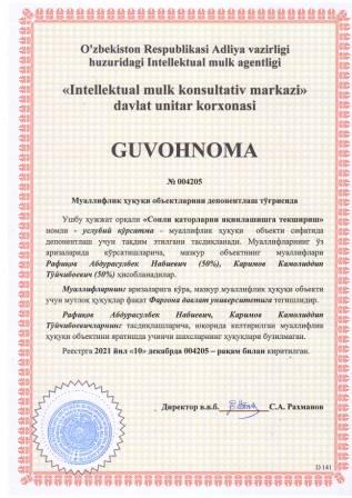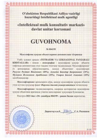 | 5896 | №004199 | Монография - "TETRAEDR VA GEKSAGONAL PANJARALI KRISTALLAR" | Расулов Рустам Явкачович (40%), Ахмедов Баходир Бахрамович (20%), Муминов Исломжон Араббоевич (20%), Умаров Бекзод Азизович (20%) | Фарғона давлат университети | 12/10/2021 | ![]() |