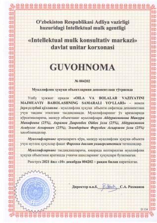 | 5893 | №004202 | Ўқув-услубий қўлланма - "OILA VA BOLALAR VAZIYATINI MAJMUAVIY BAHOLASHNING SAMARALI YO‘LLARI" | Абдурахмонова Манзура Манафовна (25%), Акрамов Давронбек Ойбек ўғли (25%), Абдурахмонов Асадулло Аскарович (25%), Эгамбердиев Ферузбек Асқаржон ўғли (25%) | Фарғона давлат университети | 12/10/2021 | ![]() |