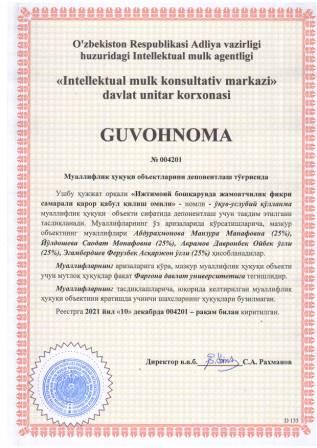 | 5894 | №004201 | Ўқув-услубий қўлланма - Ижтимоий бошқарувда жамоатчилик фикри самарали қарор қабул қилиш омили" | Абдурахмонова Манзура Манафовна (25%), Йўлдошева Саодат Монафовна (25%), Акрамов Давронбек Ойбек ўғли (25%), Эгамбердиев Ферузбек Асқаржон ўғли (25%) | Фарғона давлат университети | 12/10/2021 | ![]() |